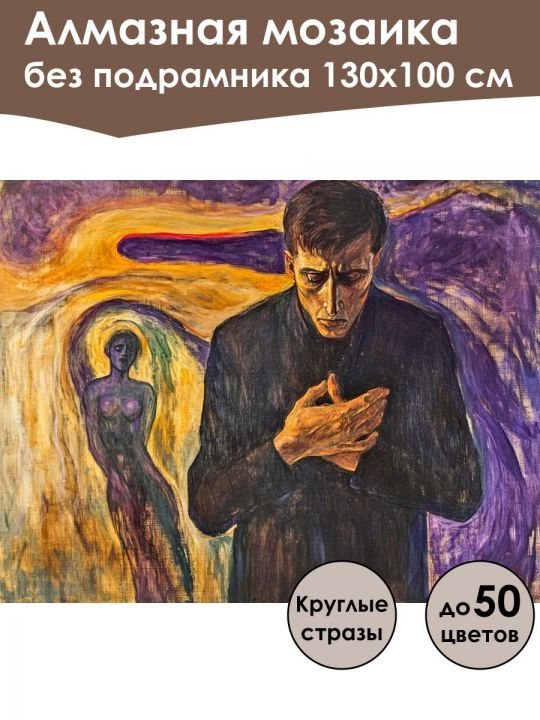 Алмазная мозаика 130×100 см собственного производства без подрамника. В картине используется до 50 оттенков для глубины цвета и плавных переходов. Надёжный клеевой слой не сохнет месяцами, стразы (26 граней) в ZIP пакетах, яркие, высокого качества и не отлетают. В наборе присутствуют дополнительно номера и инструменты, для удобства работы со стразами. Картина защищена непрозрачной бумагой. Схема напечатана водными пигментными чернилами (без свинца и запаха) в светлых пастельных тонах для комфортной работы. Плотный полухлопковый холст легко разглаживается и не мнётся. Доставляется в плотном буром тубусе. После сборки мозаика выглядит яркой и эстетичной. Узкие края предназначены для оформления в багет или обычную рамку. Картина изображает фигуру человека в чёрной одежде с выражением скорби или тревоги на лице, сцепившего руки перед собой; позади него абстрактное фоновое изображение с яркими и контрастными оттенками пурпурного и жёлтого, а также силуэт другого человека на заднем плане, создавая атмосферу напряжённости и внутреннего конфликта.