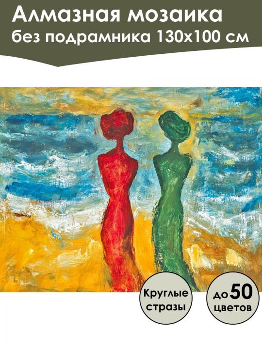 Алмазная мозаика 130×100 см собственного производства без подрамника. В картине используется до 50 оттенков для глубины цвета и плавных переходов. Надёжный клеевой слой не сохнет месяцами, стразы (26 граней) в ZIP пакетах, яркие, высокого качества и не отлетают. В наборе присутствуют дополнительно номера и инструменты, для удобства работы со стразами. Картина защищена непрозрачной бумагой. Схема напечатана водными пигментными чернилами (без свинца и запаха) в светлых пастельных тонах для комфортной работы. Плотный полухлопковый холст легко разглаживается и не мнётся. Доставляется в плотном буром тубусе. После сборки мозаика выглядит яркой и эстетичной. Узкие края предназначены для оформления в багет или обычную рамку. На картине изображены два женщина в длинных платьях, одна в красном, другая в зелёном, стоящие спиной к зрителю перед пейзажем, напоминающим берег моря с волнами и жёлтым песком, выполненные в стилизованной манере с яркими, контрастными мазками.