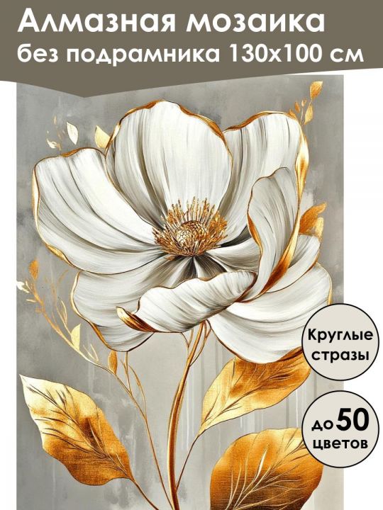 Алмазная мозаика 130×100 см собственного производства без подрамника. В картине используется до 50 оттенков для глубины цвета и плавных переходов. Надёжный клеевой слой не сохнет месяцами, стразы (26 граней) в ZIP пакетах, яркие, высокого качества и не отлетают. В наборе присутствуют дополнительно номера и инструменты, для удобства работы со стразами. Картина защищена непрозрачной бумагой. Схема напечатана водными пигментными чернилами (без свинца и запаха) в светлых пастельных тонах для комфортной работы. Плотный полухлопковый холст легко разглаживается и не мнётся. Доставляется в плотном буром тубусе. После сборки мозаика выглядит яркой и эстетичной. Узкие края предназначены для оформления в багет или обычную рамку. На изображении крупный цветок с белыми лепестками и насыщенными золотыми акцентами, что придаёт ему элегантность и роскошь; золотые листья и тонкие стебли дополняют композицию на сером фоне, создавая изысканный контраст.