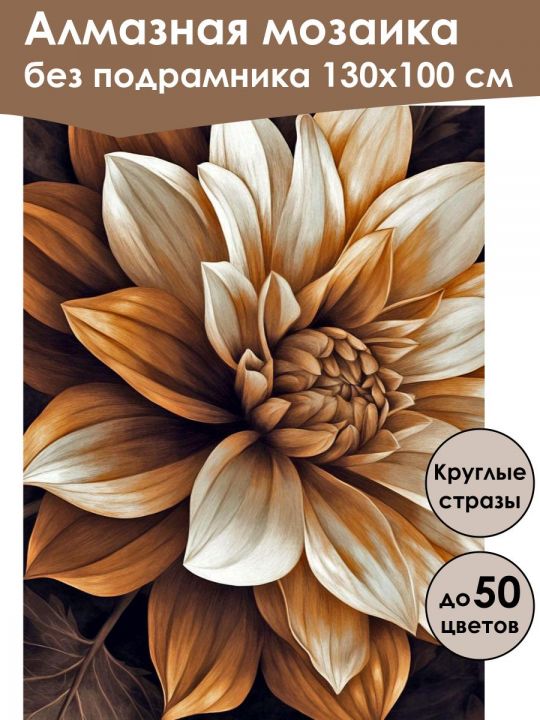 Алмазная мозаика 130×100 см собственного производства без подрамника. В картине используется до 50 оттенков для глубины цвета и плавных переходов. Надёжный клеевой слой не сохнет месяцами, стразы (26 граней) в ZIP пакетах, яркие, высокого качества и не отлетают. В наборе присутствуют дополнительно номера и инструменты, для удобства работы со стразами. Картина защищена непрозрачной бумагой. Схема напечатана водными пигментными чернилами (без свинца и запаха) в светлых пастельных тонах для комфортной работы. Плотный полухлопковый холст легко разглаживается и не мнётся. Доставляется в плотном буром тубусе. После сборки мозаика выглядит яркой и эстетичной. Узкие края предназначены для оформления в багет или обычную рамку. На изображении крупный цветок с множеством лепестков, выполненный в теплых коричнево-бежевых тонах, создающий богатый и текстурный вид, который подчеркивает глубину и объем цветка; фон также состоит из лепестков тех же оттенков, добавляя целостности и мягкости композиции.