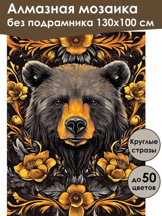 Алмазная мозаика 130×100 см собственного производства без подрамника. В картине используется до 50 оттенков для глубины цвета и плавных переходов. Надёжный клеевой слой не сохнет месяцами, стразы (26 граней) в ZIP пакетах, яркие, высокого качества и не отлетают. В наборе присутствуют дополнительно номера и инструменты, для удобства работы со стразами. Картина защищена непрозрачной бумагой. Схема напечатана водными пигментными чернилами (без свинца и запаха) в светлых пастельных тонах для комфортной работы. Плотный полухлопковый холст легко разглаживается и не мнётся. Доставляется в плотном буром тубусе. После сборки мозаика выглядит яркой и эстетичной. Узкие края предназначены для оформления в багет или обычную рамку. Изображение представляет собой художественное оформление с центральным изображением головы медведя, выполненной в насыщенных серых тонах, окружённой крупными декоративными цветами жёлто-оранжевых оттенков на тёмном фоне.
