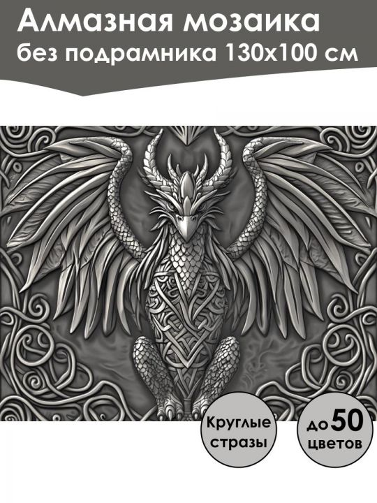 Алмазная мозаика 130×100 см собственного производства без подрамника. В картине используется до 50 оттенков для глубины цвета и плавных переходов. Надёжный клеевой слой не сохнет месяцами, стразы (26 граней) в ZIP пакетах, яркие, высокого качества и не отлетают. В наборе присутствуют дополнительно номера и инструменты, для удобства работы со стразами. Картина защищена непрозрачной бумагой. Схема напечатана водными пигментными чернилами (без свинца и запаха) в светлых пастельных тонах для комфортной работы. Плотный полухлопковый холст легко разглаживается и не мнётся. Доставляется в плотном буром тубусе. После сборки мозаика выглядит яркой и эстетичной. Узкие края предназначены для оформления в багет или обычную рамку. На изображении представлен сложный и детализированный рисунок мифического существа, напоминающего грифона, с большими крыльями и головой, украшенной рогами, переплетенными узорами в стиле кельтской графики, выполненный в оттенках серого; фон состоит из завитков и узоров, создающих ощущение древности и таинственности.