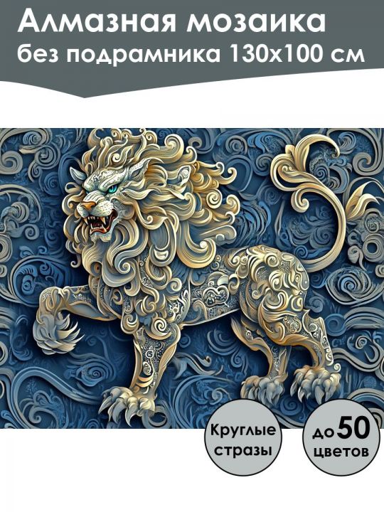 Алмазная мозаика 130×100 см собственного производства без подрамника. В картине используется до 50 оттенков для глубины цвета и плавных переходов. Надёжный клеевой слой не сохнет месяцами, стразы (26 граней) в ZIP пакетах, яркие, высокого качества и не отлетают. В наборе присутствуют дополнительно номера и инструменты, для удобства работы со стразами. Картина защищена непрозрачной бумагой. Схема напечатана водными пигментными чернилами (без свинца и запаха) в светлых пастельных тонах для комфортной работы. Плотный полухлопковый холст легко разглаживается и не мнётся. Доставляется в плотном буром тубусе. После сборки мозаика выглядит яркой и эстетичной. Узкие края предназначены для оформления в багет или обычную рамку. На изображении представлен стилизованный лев, выполненный в виде intricately detailed узоров и завитков на фоне синего цвета. Он обладает выраженной гривой и динамичной позой, что придает ему ощущение движения и силы. Фигура льва богато украшена сложными орнаментами и узорами, которые создают эффект трёхмерного пейзажа. Эта художественная композиция сочетает в себе элементы фантазии и мифологии, подчеркивая величие и силу льва.