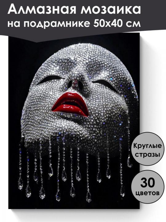 Алмазная мозаика 50×40 см собственного производства на подрамнике. В картине используется до 50 оттенков для глубины цвета и плавных переходов. Надёжный клеевой слой не сохнет месяцами, стразы (26 граней) яркие, высокого качества и не отлетают. В наборе присутствуют дополнительно ZIP пакеты, номера и инструменты, для удобства работы со стразами. Картина защищена прозрачной плёнкой. Схема напечатана водными пигментными чернилами (без свинца и запаха) в светлых пастельных тонах для комфортной работы. Плотный полухлопковый холст легко разглаживается и не мнётся. Доставляется в бурой коробке. После сборки мозаика выглядит яркой и эстетичной. Картину можно повесить на стену используя крепление которое идёт в комплекте. Изображение представляет собой скульптурное лицо, полностью покрытое блестящими камнями, с яркими, красными губами; под подбородком свисают нити с каплевидными украшениями, всё это выделяется на чёрном фоне, создавая эффект роскоши и таинственности.