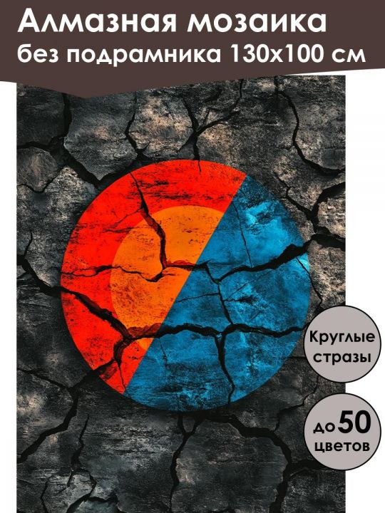 Алмазная мозаика 130×100 см собственного производства без подрамника. В картине используется до 50 оттенков для глубины цвета и плавных переходов. Надёжный клеевой слой не сохнет месяцами, стразы (26 граней) в ZIP пакетах, яркие, высокого качества и не отлетают. В наборе присутствуют дополнительно номера и инструменты, для удобства работы со стразами. Картина защищена непрозрачной бумагой. Схема напечатана водными пигментными чернилами (без свинца и запаха) в светлых пастельных тонах для комфортной работы. Плотный полухлопковый холст легко разглаживается и не мнётся. Доставляется в плотном буром тубусе. После сборки мозаика выглядит яркой и эстетичной. Узкие края предназначены для оформления в багет или обычную рамку. На изображении показан круг, разделённый на две половины: левая часть окрашена в красный цвет, а правая в синий. Поверхность круга и окружающий его фон из тёмно-серого потрескавшегося грунта, создают эффект текстурированной глубины и контраста.