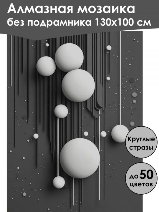 Алмазная мозаика 130×100 см собственного производства без подрамника. В картине используется до 50 оттенков для глубины цвета и плавных переходов. Надёжный клеевой слой не сохнет месяцами, стразы (26 граней) в ZIP пакетах, яркие, высокого качества и не отлетают. В наборе присутствуют дополнительно номера и инструменты, для удобства работы со стразами. Картина защищена непрозрачной бумагой. Схема напечатана водными пигментными чернилами (без свинца и запаха) в светлых пастельных тонах для комфортной работы. Плотный полухлопковый холст легко разглаживается и не мнётся. Доставляется в плотном буром тубусе. После сборки мозаика выглядит яркой и эстетичной. Узкие края предназначены для оформления в багет или обычную рамку. На изображении представлена абстрактная композиция с белыми сферами разных размеров, расположенными на тёмном фоне, украшенном вертикальными линиями и мелкими точками.