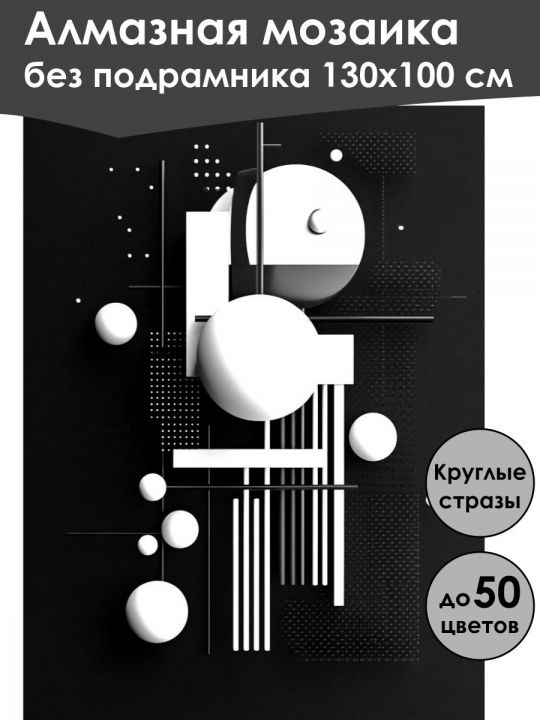 Алмазная мозаика 130×100 см собственного производства без подрамника. В картине используется до 50 оттенков для глубины цвета и плавных переходов. Надёжный клеевой слой не сохнет месяцами, стразы (26 граней) в ZIP пакетах, яркие, высокого качества и не отлетают. В наборе присутствуют дополнительно номера и инструменты, для удобства работы со стразами. Картина защищена непрозрачной бумагой. Схема напечатана водными пигментными чернилами (без свинца и запаха) в светлых пастельных тонах для комфортной работы. Плотный полухлопковый холст легко разглаживается и не мнётся. Доставляется в плотном буром тубусе. После сборки мозаика выглядит яркой и эстетичной. Узкие края предназначены для оформления в багет или обычную рамку. На изображении представлена абстрактная композиция на чёрном фоне с белыми формами, включая круги, цилиндры и линии, расположенные в геометрическом порядке, что создаёт впечатление минимализма и архитектурной строгости.