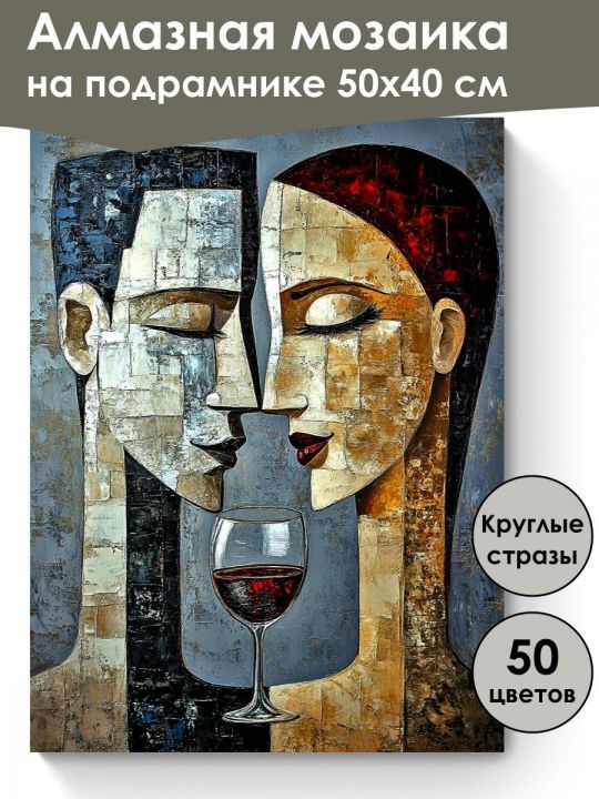 Алмазная мозаика 50×40 см собственного производства на подрамнике. В картине используется до 50 оттенков для глубины цвета и плавных переходов. Надёжный клеевой слой не сохнет месяцами, стразы (26 граней) яркие, высокого качества и не отлетают. В наборе присутствуют дополнительно ZIP пакеты, номера и инструменты, для удобства работы со стразами. Картина защищена прозрачной плёнкой. Схема напечатана водными пигментными чернилами (без свинца и запаха) в светлых пастельных тонах для комфортной работы. Плотный полухлопковый холст легко разглаживается и не мнётся. Доставляется в бурой коробке. После сборки мозаика выглядит яркой и эстетичной. Картину можно повесить на стену используя крепление которое идёт в комплекте. На картине изображены абстрактные лица мужчины и женщины, выполненные в кубистическом стиле с мозаичным эффектом. Они расположены близко друг к другу, а их профили почти соприкасаются. Между ними стоит бокал красного вина, акцентируя своим ярким цветом нейтральный фон. Мужская часть выполнена в холодных синих и серых тонах, женская - в теплых бежевых и красноватых оттенках. Композиция, подчёркивающая контраст и взаимодействие, наполнена романтическим и символическим смыслом.