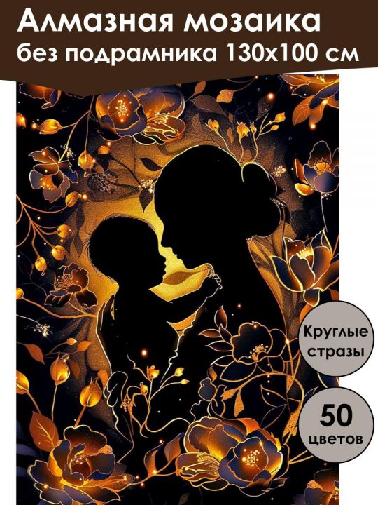 Алмазная мозаика 130×100 см собственного производства без подрамника. В картине используется до 50 оттенков для глубины цвета и плавных переходов. Надёжный клеевой слой не сохнет месяцами, стразы (26 граней) в ZIP пакетах, яркие, высокого качества и не отлетают. В наборе присутствуют дополнительно номера и инструменты, для удобства работы со стразами. Картина защищена непрозрачной бумагой. Схема напечатана водными пигментными чернилами (без свинца и запаха) в светлых пастельных тонах для комфортной работы. Плотный полухлопковый холст легко разглаживается и не мнётся. Доставляется в плотном буром тубусе. После сборки мозаика выглядит яркой и эстетичной. Узкие края предназначены для оформления в багет или обычную рамку. Изображение представляет собой силуэт женщины, держащей на руках младенца, на фоне богатого узора из цветов в золотисто-оранжевых и синих тонах.