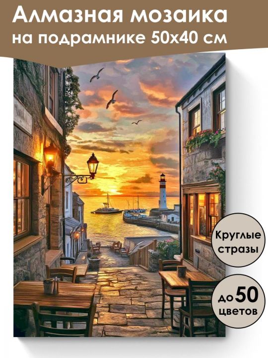 Алмазная мозаика 50×40 см собственного производства на подрамнике. В картине используется до 50 оттенков для глубины цвета и плавных переходов. Надёжный клеевой слой не сохнет месяцами, стразы (26 граней) яркие, высокого качества и не отлетают. В наборе присутствуют дополнительно ZIP пакеты, номера и инструменты, для удобства работы со стразами. Картина защищена прозрачной плёнкой. Схема напечатана водными пигментными чернилами (без свинца и запаха) в светлых пастельных тонах для комфортной работы. Плотный полухлопковый холст легко разглаживается и не мнётся. Доставляется в бурой коробке. После сборки мозаика выглядит яркой и эстетичной. Картину можно повесить на стену используя крепление которое идёт в комплекте. Узкая мощёная улочка вечером с видом на море; по бокам старинные каменные здания с освещёнными окнами и фонарями, столики уличного кафе, на фоне закатное небо с облаками и парящими птицами, вдалеке виден маяк и лодка в гавани.