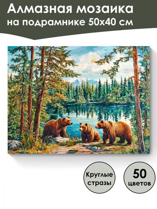 Алмазная мозаика 50×40 см собственного производства на подрамнике. В картине используется до 50 оттенков для глубины цвета и плавных переходов. Надёжный клеевой слой не сохнет месяцами, стразы (26 граней) яркие, высокого качества и не отлетают. В наборе присутствуют дополнительно ZIP пакеты, номера и инструменты, для удобства работы со стразами. Картина защищена прозрачной плёнкой. Схема напечатана водными пигментными чернилами (без свинца и запаха) в светлых пастельных тонах для комфортной работы. Плотный полухлопковый холст легко разглаживается и не мнётся. Доставляется в бурой коробке. После сборки мозаика выглядит яркой и эстетичной. Картину можно повесить на стену используя крепление которое идёт в комплекте. На изображении три медведя стоят у живописного лесного озера, окружённого соснами и елями, с виднеющимися вдалеке заснеженными горными вершинами под голубым небом с лёгкими облаками, создавая атмосферу спокойной и величественной дикой природы.