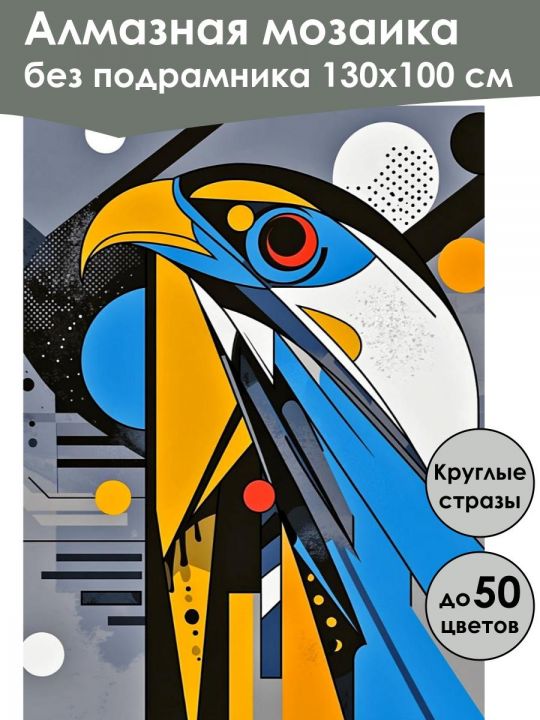 Алмазная мозаика 130×100 см собственного производства без подрамника. В картине используется до 50 оттенков для глубины цвета и плавных переходов. Надёжный клеевой слой не сохнет месяцами, стразы (26 граней) в ZIP пакетах, яркие, высокого качества и не отлетают. В наборе присутствуют дополнительно номера и инструменты, для удобства работы со стразами. Картина защищена непрозрачной бумагой. Схема напечатана водными пигментными чернилами (без свинца и запаха) в светлых пастельных тонах для комфортной работы. Плотный полухлопковый холст легко разглаживается и не мнётся. Доставляется в плотном буром тубусе. После сборки мозаика выглядит яркой и эстетичной. Узкие края предназначены для оформления в багет или обычную рамку. На изображении представлен абстрактный арт-портрет орла, выполненный в ярких цветах с использованием геометрических форм и линий; доминируют жёлтые, синие и черные оттенки, создавая динамичное и современное впечатление, с акцентом на голову и клюв птицы, что придаёт произведению выразительность и эмоциональный заряд.