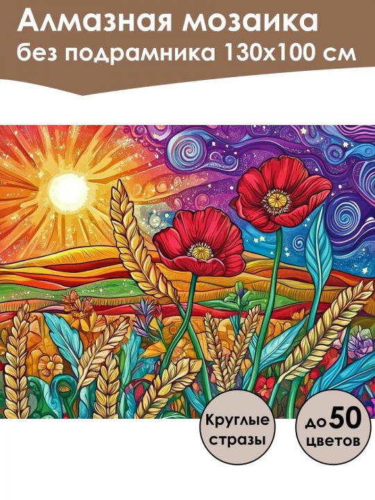 Алмазная мозаика 130×100 см собственного производства без подрамника. В картине используется до 50 оттенков для глубины цвета и плавных переходов. Надёжный клеевой слой не сохнет месяцами, стразы (26 граней) в ZIP пакетах, яркие, высокого качества и не отлетают. В наборе присутствуют дополнительно номера и инструменты, для удобства работы со стразами. Картина защищена непрозрачной бумагой. Схема напечатана водными пигментными чернилами (без свинца и запаха) в светлых пастельных тонах для комфортной работы. Плотный полухлопковый холст легко разглаживается и не мнётся. Доставляется в плотном буром тубусе. После сборки мозаика выглядит яркой и эстетичной. Узкие края предназначены для оформления в багет или обычную рамку. На изображении представлен красочный пейзаж в стилизованной манере, где крупные красные цветы и золотые колосья пшеницы находятся на переднем плане, в то время как вдали виднеются холмы с яркими полосами зелёного, жёлтого и оранжевого оттенков; на фоне сияет яркое солнце, озаряя живописное небо с завихрениями фиолетового и синего цветов, создавая атмосферу уникальной динамики и выразительности.