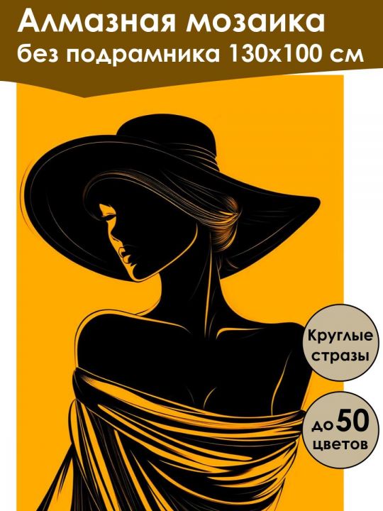 Алмазная мозаика 130×100 см собственного производства без подрамника. В картине используется до 50 оттенков для глубины цвета и плавных переходов. Надёжный клеевой слой не сохнет месяцами, стразы (26 граней) в ZIP пакетах, яркие, высокого качества и не отлетают. В наборе присутствуют дополнительно номера и инструменты, для удобства работы со стразами. Картина защищена непрозрачной бумагой. Схема напечатана водными пигментными чернилами (без свинца и запаха) в светлых пастельных тонах для комфортной работы. Плотный полухлопковый холст легко разглаживается и не мнётся. Доставляется в плотном буром тубусе. После сборки мозаика выглядит яркой и эстетичной. Узкие края предназначены для оформления в багет или обычную рамку. Силуэт женской фигуры в профиль изображён на ярко-оранжевом фоне; женщина в широкополой шляпе с опущенной головой, её плечи окутаны тканью, подчёркивающей гибкость позы и элегантность образа.