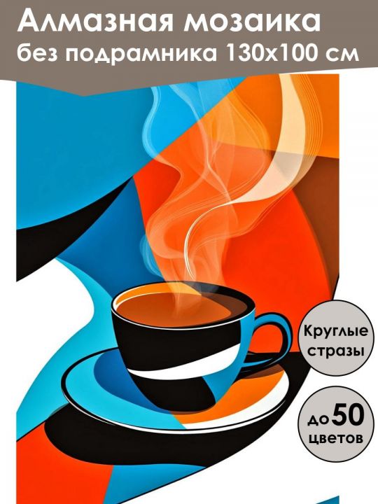 Алмазная мозаика 130×100 см собственного производства без подрамника. В картине используется до 50 оттенков для глубины цвета и плавных переходов. Надёжный клеевой слой не сохнет месяцами, стразы (26 граней) в ZIP пакетах, яркие, высокого качества и не отлетают. В наборе присутствуют дополнительно номера и инструменты, для удобства работы со стразами. Картина защищена непрозрачной бумагой. Схема напечатана водными пигментными чернилами (без свинца и запаха) в светлых пастельных тонах для комфортной работы. Плотный полухлопковый холст легко разглаживается и не мнётся. Доставляется в плотном буром тубусе. После сборки мозаика выглядит яркой и эстетичной. Узкие края предназначены для оформления в багет или обычную рамку. На изображении представлена яркая абстрактная композиция с чашкой кофе на блюдце, выполненная в насыщенных оттенках синего, оранжевого и коричневого цветов, с поднимающимся паром, создающим ощущение тепла и уюта.