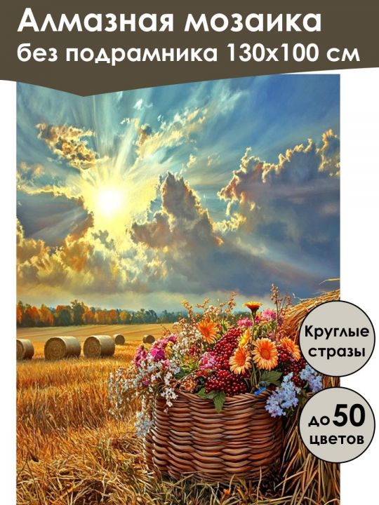 Алмазная мозаика 130×100 см собственного производства без подрамника. В картине используется до 50 оттенков для глубины цвета и плавных переходов. Надёжный клеевой слой не сохнет месяцами, стразы (26 граней) в ZIP пакетах, яркие, высокого качества и не отлетают. В наборе присутствуют дополнительно номера и инструменты, для удобства работы со стразами. Картина защищена непрозрачной бумагой. Схема напечатана водными пигментными чернилами (без свинца и запаха) в светлых пастельных тонах для комфортной работы. Плотный полухлопковый холст легко разглаживается и не мнётся. Доставляется в плотном буром тубусе. После сборки мозаика выглядит яркой и эстетичной. Узкие края предназначены для оформления в багет или обычную рамку. На изображении показано солнечное поле с тюками сена на дальнем плане, под ярким небом, где рассекаются облака, излучая золотистый свет, на переднем плане находится корзина, полная разноцветных полевых цветов, которая стоит на земле рядом с тюком сена.
