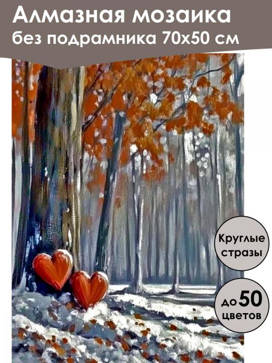 Алмазная мозаика 70×50 см собственного производства без подрамника. В картине используется до 50 оттенков для глубины цвета и плавных переходов. Надёжный клеевой слой не сохнет месяцами, стразы (26 граней) яркие, высокого качества и не отлетают. В наборе присутствуют дополнительно ZIP пакеты, номера и инструменты, для удобства работы со стразами. Картина защищена непрозрачной бумагой. Схема напечатана водными пигментными чернилами (без свинца и запаха) в светлых пастельных тонах для комфортной работы. Плотный полухлопковый холст легко разглаживается и не мнётся. Доставляется в бурой коробке. После сборки мозаика выглядит яркой и эстетичной. Узкие края предназначены для оформления в багет или обычную рамку. На изображении показан зимний лес с покрытыми снегом деревьями, среди которых выделяются ярко-оранжевые листья. У подножия одного из деревьев лежат две стилизованные красные сердцевидные формы, создавая контраст с холодной палитрой окружающей природы. Атмосфера картины сочетает в себе тепло и холод, гармонично соединяя элементы осени и зимы.