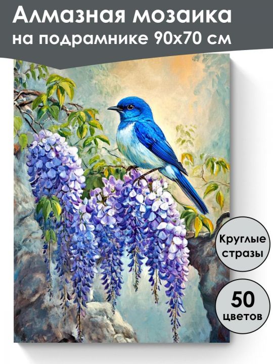 Алмазная мозаика 90×70 см собственного производства на подрамнике. В картине используется до 50 оттенков для глубины цвета и плавных переходов. Надёжный клеевой слой не сохнет месяцами, стразы (26 граней) в ZIP пакетах, яркие, высокого качества и не отлетают. В наборе присутствуют дополнительно, номера и инструменты, для удобства работы со стразами. Картина защищена прозрачной плёнкой. Схема напечатана водными пигментными чернилами (без свинца и запаха) в светлых пастельных тонах для комфортной работы. Плотный полухлопковый холст легко разглаживается и не мнётся. Доставляется в бурой коробке. После сборки мозаика выглядит яркой и эстетичной. Картину можно повесить на стену используя крепление которое идёт в комплекте. Ярко-синяя птица сидит на ветке среди каскадов фиолетовой глицинии, окружённая листвой и мягким светом, создающим атмосферу спокойствия и красоты.