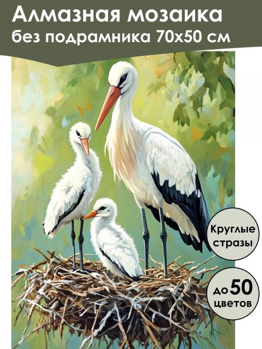 Алмазная мозаика 70×50 см собственного производства без подрамника. В картине используется до 50 оттенков для глубины цвета и плавных переходов. Надёжный клеевой слой не сохнет месяцами, стразы (26 граней) яркие, высокого качества и не отлетают. В наборе присутствуют дополнительно ZIP пакеты, номера и инструменты, для удобства работы со стразами. Картина защищена непрозрачной бумагой. Схема напечатана водными пигментными чернилами (без свинца и запаха) в светлых пастельных тонах для комфортной работы. Плотный полухлопковый холст легко разглаживается и не мнётся. Доставляется в бурой коробке. После сборки мозаика выглядит яркой и эстетичной. Узкие края предназначены для оформления в багет или обычную рамку. Это изображение показывает гнездо с аистами: один взрослый аист с белым оперением и черными крыльями заботливо стоит рядом с двумя пушистыми птенцами; фон выполнен в нежных зеленых и желтых оттенках, создавая атмосферу тепла и безопасности.