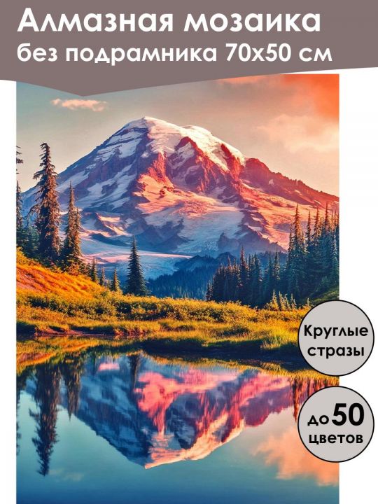 Алмазная мозаика 70×50 см собственного производства без подрамника. В картине используется до 50 оттенков для глубины цвета и плавных переходов. Надёжный клеевой слой не сохнет месяцами, стразы (26 граней) яркие, высокого качества и не отлетают. В наборе присутствуют дополнительно ZIP пакеты, номера и инструменты, для удобства работы со стразами. Картина защищена непрозрачной бумагой. Схема напечатана водными пигментными чернилами (без свинца и запаха) в светлых пастельных тонах для комфортной работы. Плотный полухлопковый холст легко разглаживается и не мнётся. Доставляется в бурой коробке. После сборки мозаика выглядит яркой и эстетичной. Узкие края предназначены для оформления в багет или обычную рамку. Горный пейзаж с заснеженной вершиной, освещённой тёплыми лучами заходящего солнца, отражается в спокойной поверхности озера, окружённого густыми соснами, создавая атмосферу спокойствия и величия природы.