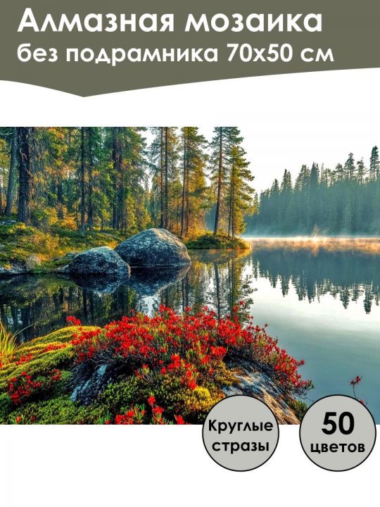 Алмазная мозаика 70×50 см собственного производства без подрамника. В картине используется до 50 оттенков для глубины цвета и плавных переходов. Надёжный клеевой слой не сохнет месяцами, стразы (26 граней) яркие, высокого качества и не отлетают. В наборе присутствуют дополнительно ZIP пакеты, номера и инструменты, для удобства работы со стразами. Картина защищена непрозрачной бумагой. Схема напечатана водными пигментными чернилами (без свинца и запаха) в светлых пастельных тонах для комфортной работы. Плотный полухлопковый холст легко разглаживается и не мнётся. Доставляется в бурой коробке. После сборки мозаика выглядит яркой и эстетичной. Узкие края предназначены для оформления в багет или обычную рамку. Тихое озеро отражает высокие сосны и густой лесной массив на фоне, в углу которого находится небольшой островок с красными цветами и крупными камнями, создавая живописную атмосферу утреннего умиротворения под легким туманом.