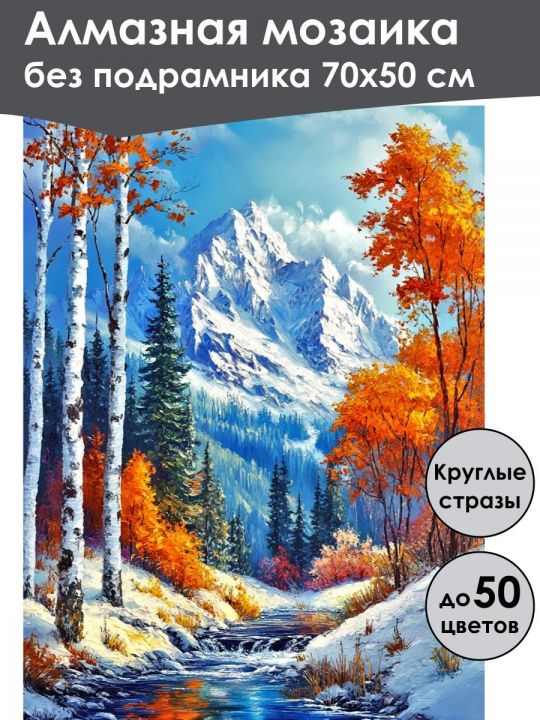Алмазная мозаика 70×50 см собственного производства без подрамника. В картине используется до 50 оттенков для глубины цвета и плавных переходов. Надёжный клеевой слой не сохнет месяцами, стразы (26 граней) яркие, высокого качества и не отлетают. В наборе присутствуют дополнительно ZIP пакеты, номера и инструменты, для удобства работы со стразами. Картина защищена непрозрачной бумагой. Схема напечатана водными пигментными чернилами (без свинца и запаха) в светлых пастельных тонах для комфортной работы. Плотный полухлопковый холст легко разглаживается и не мнётся. Доставляется в бурой коробке. После сборки мозаика выглядит яркой и эстетичной. Узкие края предназначены для оформления в багет или обычную рамку. На картине изображён осенний пейзаж с заснеженными горами на заднем плане, окружёнными голубым небом и лёгкими облаками. Впереди течёт небольшой ручей среди деревьев с яркими оранжевыми и золотыми листьями, среди которых выделяются белые стволы берёз. Земля покрыта снежным покровом, подчёркивающим контраст яркой листвы и тёмно-зелёных хвойных деревьев.