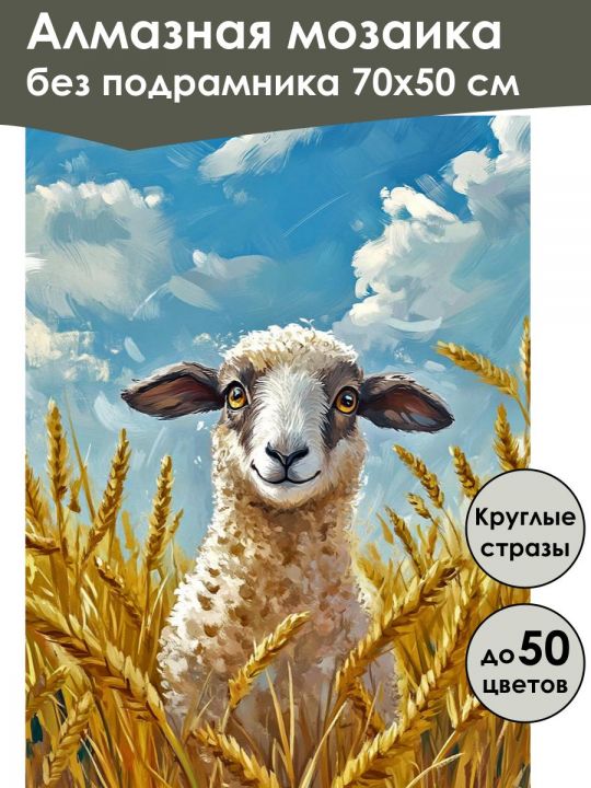 Алмазная мозаика 70×50 см собственного производства без подрамника. В картине используется до 50 оттенков для глубины цвета и плавных переходов. Надёжный клеевой слой не сохнет месяцами, стразы (26 граней) яркие, высокого качества и не отлетают. В наборе присутствуют дополнительно ZIP пакеты, номера и инструменты, для удобства работы со стразами. Картина защищена непрозрачной бумагой. Схема напечатана водными пигментными чернилами (без свинца и запаха) в светлых пастельных тонах для комфортной работы. Плотный полухлопковый холст легко разглаживается и не мнётся. Доставляется в бурой коробке. После сборки мозаика выглядит яркой и эстетичной. Узкие края предназначены для оформления в багет или обычную рамку. На изображении нарисована овца, выглядывающая из густых золотистых колосьев пшеницы на фоне ярко-голубого неба с пушистыми облаками.