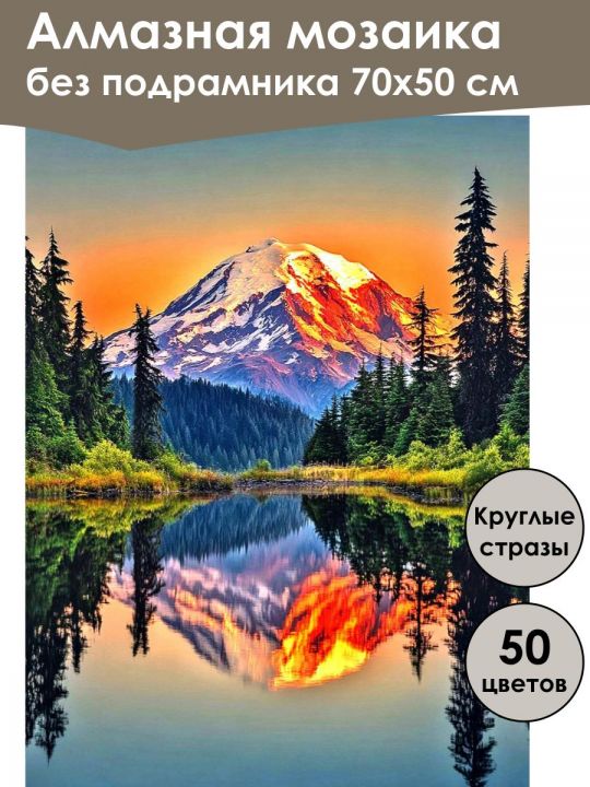Алмазная мозаика 70×50 см собственного производства без подрамника. В картине используется до 50 оттенков для глубины цвета и плавных переходов. Надёжный клеевой слой не сохнет месяцами, стразы (26 граней) яркие, высокого качества и не отлетают. В наборе присутствуют дополнительно ZIP пакеты, номера и инструменты, для удобства работы со стразами. Картина защищена непрозрачной бумагой. Схема напечатана водными пигментными чернилами (без свинца и запаха) в светлых пастельных тонах для комфортной работы. Плотный полухлопковый холст легко разглаживается и не мнётся. Доставляется в бурой коробке. После сборки мозаика выглядит яркой и эстетичной. Узкие края предназначены для оформления в багет или обычную рамку. На изображении величественная снежная гора, освещённая яркими оранжевыми и розовыми лучами заката, отражается в спокойной глади озера, окружённого густыми хвойными деревьями.