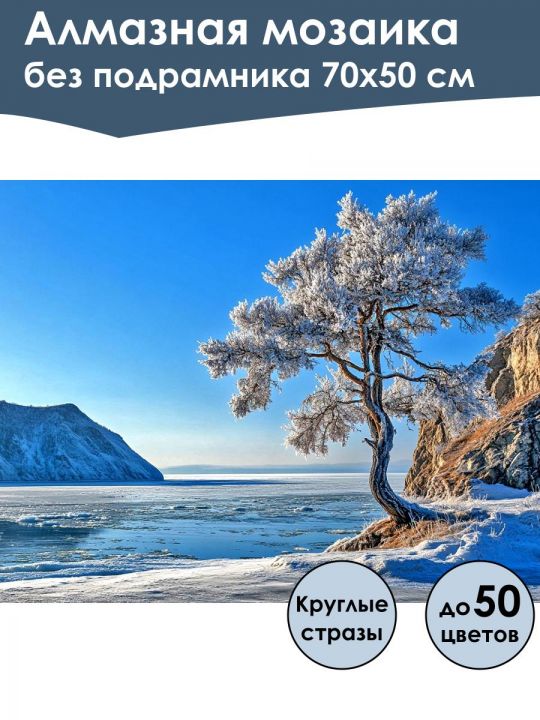Алмазная мозаика 70×50 см собственного производства без подрамника. В картине используется до 50 оттенков для глубины цвета и плавных переходов. Надёжный клеевой слой не сохнет месяцами, стразы (26 граней) яркие, высокого качества и не отлетают. В наборе присутствуют дополнительно ZIP пакеты, номера и инструменты, для удобства работы со стразами. Картина защищена непрозрачной бумагой. Схема напечатана водными пигментными чернилами (без свинца и запаха) в светлых пастельных тонах для комфортной работы. Плотный полухлопковый холст легко разглаживается и не мнётся. Доставляется в бурой коробке. После сборки мозаика выглядит яркой и эстетичной. Узкие края предназначены для оформления в багет или обычную рамку. Зимний пейзаж с одиноким деревом, покрытым инеем, стоящим у замерзшего озера на фоне скал и заснеженных гор, под ярким голубым небом.