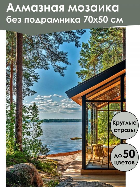 Алмазная мозаика 70×50 см собственного производства без подрамника. В картине используется до 50 оттенков для глубины цвета и плавных переходов. Надёжный клеевой слой не сохнет месяцами, стразы (26 граней) яркие, высокого качества и не отлетают. В наборе присутствуют дополнительно ZIP пакеты, номера и инструменты, для удобства работы со стразами. Картина защищена непрозрачной бумагой. Схема напечатана водными пигментными чернилами (без свинца и запаха) в светлых пастельных тонах для комфортной работы. Плотный полухлопковый холст легко разглаживается и не мнётся. Доставляется в бурой коробке. После сборки мозаика выглядит яркой и эстетичной. Узкие края предназначены для оформления в багет или обычную рамку. На изображении представлено современное остеклённое строение, расположенное на берегу живописного озера, окружённого густым лесом с высокими соснами; яркое солнечное освещение подчёркивает зелёные оттенки листвы и голубое небо, создавая атмосферу уединения и природной гармонии.