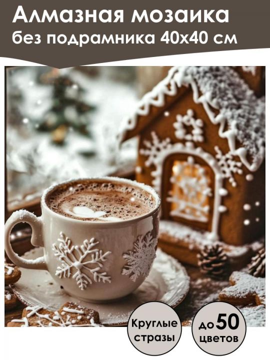 Алмазная мозаика 40×40 см собственного производства без подрамника. В картине используется до 50 оттенков для глубины цвета и плавных переходов. Надёжный клеевой слой не сохнет месяцами, стразы (26 граней) яркие, высокого качества и не отлетают. В наборе присутствуют дополнительно ZIP пакеты, номера и инструменты, для удобства работы со стразами. Картина защищена непрозрачной бумагой. Схема напечатана водными пигментными чернилами (без свинца и запаха) в светлых пастельных тонах для комфортной работы. Плотный полухлопковый холст легко разглаживается и не мнётся. Доставляется в бурой коробке. После сборки мозаика выглядит яркой и эстетичной. Узкие края предназначены для оформления в багет или обычную рамку. На изображении видна планета Земля из космоса, её поверхность покрыта облаками, океанами и континентами, заметен Североамериканский континент, окружённый глубоким синим цветом вод мирового океана, вокруг планеты наблюдается чёрный космический фон с отдельными яркими звёздами. На изображении в уютной зимней атмосфере представлена кружка горячего шоколада с рельефными снежинками, стоящая на блюдце, окружённая пряничными печеньями, украшенными сахарной глазурью в виде снежинок; на заднем плане виден пряничный домик с белыми узорами, создавать настроение зимней сказки за заснеженным окном.