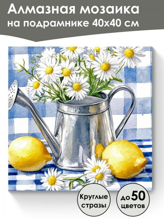 Алмазная мозаика 40×40 см собственного производства на подрамнике. В картине используется до 50 оттенков для глубины цвета и плавных переходов. Надёжный клеевой слой не сохнет месяцами, стразы (26 граней) яркие, высокого качества и не отлетают. В наборе присутствуют дополнительно ZIP пакеты, номера и инструменты, для удобства работы со стразами. Картина защищена прозрачной бумагой. Схема напечатана водными пигментными чернилами (без свинца и запаха) в светлых пастельных тонах для комфортной работы. Плотный полухлопковый холст легко разглаживается и не мнётся. Доставляется в бурой коробке. После сборки мозаика выглядит яркой и эстетичной. После сборки картину можно повесить на стену используя крепление которое идёт в комплекте. На изображении видна планета Земля из космоса, её поверхность покрыта облаками, океанами и континентами, заметен Североамериканский континент, окружённый глубоким синим цветом вод мирового океана, вокруг планеты наблюдается чёрный космический фон с отдельными яркими звёздами. На изображении представлен натюрморт в акварельной технике: металлическая лейка, из которой выглядывает букет белых ромашек с жёлтыми серединками, стоит на голубой клетчатой скатерти, рядом расположены два ярко-жёлтых лимона, а вокруг несколько ромашек.