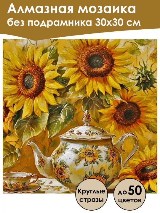 Алмазная мозаика 30×30 см собственного производства без подрамника. В картине используется до 40 оттенков для глубины цвета и плавных переходов. Надёжный клеевой слой не сохнет месяцами, стразы (26 граней) яркие, высокого качества и не отлетают. В наборе присутствуют дополнительно ZIP пакеты, номера и инструменты, для удобства работы со стразами. Картина защищена непрозрачной бумагой. Схема напечатана водными пигментными чернилами (без свинца и запаха) в светлых пастельных тонах для комфортной работы. Плотный полухлопковый холст легко разглаживается и не мнётся. Доставляется в бурой коробке. После сборки мозаика выглядит яркой и эстетичной. Узкие края предназначены для оформления в багет или обычную рамку. На изображении видна планета Земля из космоса, её поверхность покрыта облаками, океанами и континентами, заметен Североамериканский континент, окружённый глубоким синим цветом вод мирового океана, вокруг планеты наблюдается чёрный космический фон с отдельными яркими звёздами. На изображении яркий натюрморт с крупными подсолнухами на фоне, их ярко-жёлтые лепестки и зелёные листья создают живописную композицию, перед ними стоит изящный чайник и чашка с блюдцем, украшенные таким же цветочным узором, все детали выполнены в теплых золотисто-жёлтых тонах, создающих атмосферу уюта и солнечного настроения.