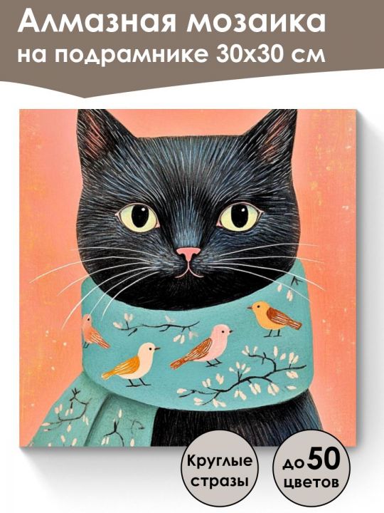 Алмазная мозаика 30×30 см собственного производства на подрамнике. В картине используется до 50 оттенков для глубины цвета и плавных переходов. Надёжный клеевой слой не сохнет месяцами, стразы (26 граней) яркие, высокого качества и не отлетают. В наборе присутствуют дополнительно ZIP пакеты, номера и инструменты, для удобства работы со стразами. Картина защищена прозрачной бумагой. Схема напечатана водными пигментными чернилами (без свинца и запаха) в светлых пастельных тонах для комфортной работы. Плотный полухлопковый холст легко разглаживается и не мнётся. Доставляется в бурой коробке. После сборки мозаика выглядит яркой и эстетичной. После сборки картину можно повесить на стену используя крепление которое идёт в комплекте. На изображении видна планета Земля из космоса, её поверхность покрыта облаками, океанами и континентами, заметен Североамериканский континент, окружённый глубоким синим цветом вод мирового океана, вокруг планеты наблюдается чёрный космический фон с отдельными яркими звёздами. На изображении симпатичная черная кошка с большими светлыми глазами, одетая в бирюзовый шарф с рисунками разноцветных птиц и веточек, на фоне теплого персикового оттенка; кошка выглядит очаровательной и внимательной.