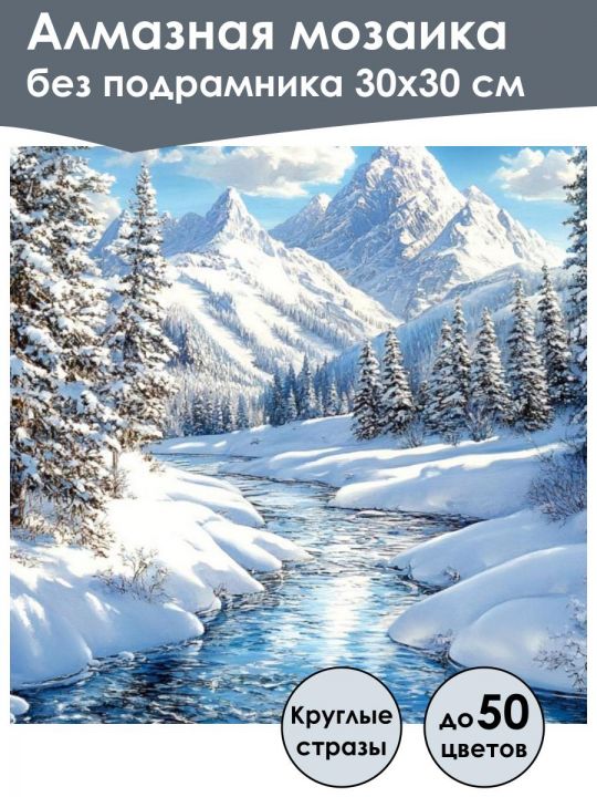 Алмазная мозаика 30×30 см собственного производства без подрамника. В картине используется до 40 оттенков для глубины цвета и плавных переходов. Надёжный клеевой слой не сохнет месяцами, стразы (26 граней) яркие, высокого качества и не отлетают. В наборе присутствуют дополнительно ZIP пакеты, номера и инструменты, для удобства работы со стразами. Картина защищена непрозрачной бумагой. Схема напечатана водными пигментными чернилами (без свинца и запаха) в светлых пастельных тонах для комфортной работы. Плотный полухлопковый холст легко разглаживается и не мнётся. Доставляется в бурой коробке. После сборки мозаика выглядит яркой и эстетичной. Узкие края предназначены для оформления в багет или обычную рамку. На изображении видна планета Земля из космоса, её поверхность покрыта облаками, океанами и континентами, заметен Североамериканский континент, окружённый глубоким синим цветом вод мирового океана, вокруг планеты наблюдается чёрный космический фон с отдельными яркими звёздами. Зимний пейзаж с величественными заснеженными горами на горизонте и узкой прозрачной рекой, извивающейся между сугробами и заснеженными ёлками на фоне яркого голубого неба с облаками.