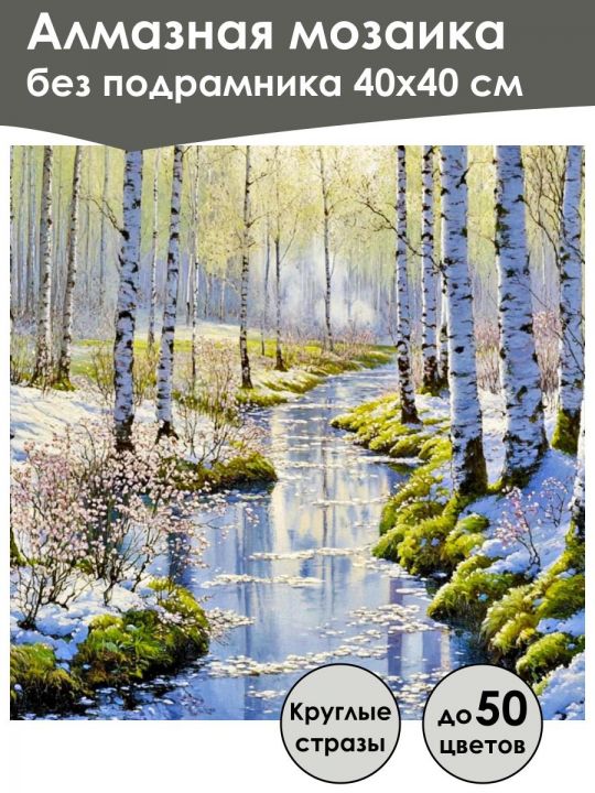 Алмазная мозаика 40×40 см собственного производства без подрамника. В картине используется до 50 оттенков для глубины цвета и плавных переходов. Надёжный клеевой слой не сохнет месяцами, стразы (26 граней) яркие, высокого качества и не отлетают. В наборе присутствуют дополнительно ZIP пакеты, номера и инструменты, для удобства работы со стразами. Картина защищена непрозрачной бумагой. Схема напечатана водными пигментными чернилами (без свинца и запаха) в светлых пастельных тонах для комфортной работы. Плотный полухлопковый холст легко разглаживается и не мнётся. Доставляется в бурой коробке. После сборки мозаика выглядит яркой и эстетичной. Узкие края предназначены для оформления в багет или обычную рамку. На изображении видна планета Земля из космоса, её поверхность покрыта облаками, океанами и континентами, заметен Североамериканский континент, окружённый глубоким синим цветом вод мирового океана, вокруг планеты наблюдается чёрный космический фон с отдельными яркими звёздами. На изображении захватывающий вид лесной весенний пейзаж с берёзами, через который протекает извилистый ручей, отражающий яркое голубое небо; вдоль берега ручья и среди деревьев лежит свежевыпавший снег, создавая контраст с молодой травой и нежными цветущими кустарниками, которые обозначают переход от зимы к весне.