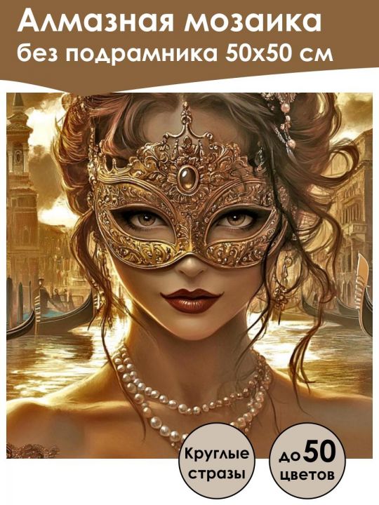 Алмазная мозаика 50×50 см собственного производства без подрамника. В картине используется до 50 оттенков для глубины цвета и плавных переходов. Надёжный клеевой слой не сохнет месяцами, стразы (26 граней) яркие, высокого качества и не отлетают. В наборе присутствуют дополнительно ZIP пакеты, номера и инструменты, для удобства работы со стразами. Картина защищена непрозрачной бумагой. Схема напечатана водными пигментными чернилами (без свинца и запаха) в светлых пастельных тонах для комфортной работы. Плотный полухлопковый холст легко разглаживается и не мнётся. Доставляется в бурой коробке. После сборки мозаика выглядит яркой и эстетичной. Узкие края предназначены для оформления в багет или обычную рамку. На изображении видна планета Земля из космоса, её поверхность покрыта облаками, океанами и континентами, заметен Североамериканский континент, окружённый глубоким синим цветом вод мирового океана, вокруг планеты наблюдается чёрный космический фон с отдельными яркими звёздами. Изображение показывает женщину в роскошной золотой маске с орнаментами, на фоне венецианского канала с гондолами и архитектурой, обладая загадочным выражением лица, украшенная ожерельем из жемчуга; участок освещён теплым закатным светом, придающим сцене атмосферу загадочного карнавала или маскарада.