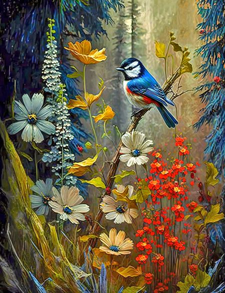 Алмазная мозаика на подрамнике «Птица на цветах» 70x50 см, 50 цветов