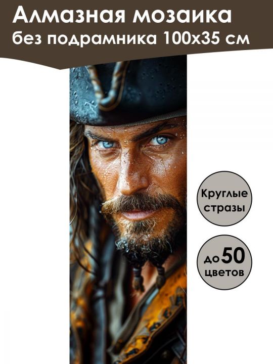 Алмазная мозаика 100×35 см собственного производства без подрамника. В картине используется до 50 оттенков для глубины цвета и плавных переходов. Надёжный клеевой слой не сохнет месяцами, стразы (26 граней) яркие, высокого качества и не отлетают. В наборе присутствуют дополнительно ZIP пакеты, номера и инструменты, для удобства работы со стразами. Картина защищена непрозрачной бумагой. Схема напечатана водными пигментными чернилами (без свинца и запаха) в светлых пастельных тонах для комфортной работы. Плотный полухлопковый холст легко разглаживается и не мнётся. Доставляется в бурой коробке. После сборки мозаика выглядит яркой и эстетичной. Узкие края предназначены для оформления в багет или обычную рамку. На изображении изображён человек с проницательным взглядом, облачённый в пиратский костюм; его длинные волосы слегка влажные, вероятно, от дождя, а из-под трёхрогой шляпы видны ярко-голубые глаза и густая борода с заплетённой косичкой, создающая впечатление смелого и мужественного образа.