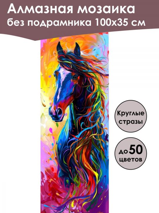 Алмазная мозаика 100×35 см собственного производства без подрамника. В картине используется до 50 оттенков для глубины цвета и плавных переходов. Надёжный клеевой слой не сохнет месяцами, стразы (26 граней) яркие, высокого качества и не отлетают. В наборе присутствуют дополнительно ZIP пакеты, номера и инструменты, для удобства работы со стразами. Картина защищена непрозрачной бумагой. Схема напечатана водными пигментными чернилами (без свинца и запаха) в светлых пастельных тонах для комфортной работы. Плотный полухлопковый холст легко разглаживается и не мнётся. Доставляется в бурой коробке. После сборки мозаика выглядит яркой и эстетичной. Узкие края предназначены для оформления в багет или обычную рамку. Это изображение современной картины, на которой изображена голова лошади в стиле абстрактного искусства, выполненная яркими и насыщенными цветами. Лошадь смотрит прямо перед собой, её грива и шея переливаются оттенками синего, красного, оранжевого и фиолетового. Фон также выполнен в палитре насыщенных цветов, создавая эффект энергии и движения.