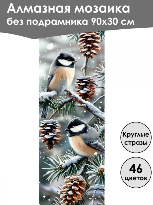 Алмазная мозаика 90×30 см собственного производства без подрамника. В картине используется до 50 оттенков для глубины цвета и плавных переходов. Надёжный клеевой слой не сохнет месяцами, стразы (26 граней) яркие, высокого качества и не отлетают. В наборе присутствуют дополнительно ZIP пакеты, номера и инструменты, для удобства работы со стразами. Картина защищена непрозрачной бумагой. Схема напечатана водными пигментными чернилами (без свинца и запаха) в светлых пастельных тонах для комфортной работы. Плотный полухлопковый холст легко разглаживается и не мнётся. Доставляется в бурой коробке. После сборки мозаика выглядит яркой и эстетичной. Узкие края предназначены для оформления в багет или обычную рамку. На изображении две синички сидят на заснеженных ветках ели, окружённые шишками, на фоне падающей снежной крошки; птицы выглядят уютно, с пушистыми перьями, подчёркивающими зимнюю атмосферу.