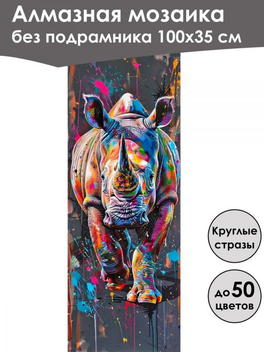 Алмазная мозаика 100×35 см собственного производства без подрамника. В картине используется до 50 оттенков для глубины цвета и плавных переходов. Надёжный клеевой слой не сохнет месяцами, стразы (26 граней) яркие, высокого качества и не отлетают. В наборе присутствуют дополнительно ZIP пакеты, номера и инструменты, для удобства работы со стразами. Картина защищена непрозрачной бумагой. Схема напечатана водными пигментными чернилами (без свинца и запаха) в светлых пастельных тонах для комфортной работы. Плотный полухлопковый холст легко разглаживается и не мнётся. Доставляется в бурой коробке. После сборки мозаика выглядит яркой и эстетичной. Узкие края предназначены для оформления в багет или обычную рамку. На изображении представлен носорог, выполненный в стиле поп-арт, с использованием ярких и насыщенных цветов, которые контрастируют с темным фоном; краски, как будто разбрызганные по холсту, создают динамичный и современный облик животного.