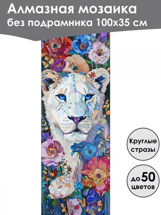 Алмазная мозаика 100×35 см собственного производства без подрамника. В картине используется до 50 оттенков для глубины цвета и плавных переходов. Надёжный клеевой слой не сохнет месяцами, стразы (26 граней) яркие, высокого качества и не отлетают. В наборе присутствуют дополнительно ZIP пакеты, номера и инструменты, для удобства работы со стразами. Картина защищена непрозрачной бумагой. Схема напечатана водными пигментными чернилами (без свинца и запаха) в светлых пастельных тонах для комфортной работы. Плотный полухлопковый холст легко разглаживается и не мнётся. Доставляется в бурой коробке. После сборки мозаика выглядит яркой и эстетичной. Узкие края предназначены для оформления в багет или обычную рамку. На изображении представлен художественный портрет белого льва с ярко-синими глазами, окружённого разноцветными цветами, такими как красные, розовые, синие и фиолетовые, на тёмном фоне, создавая яркий и впечатляющий контраст.