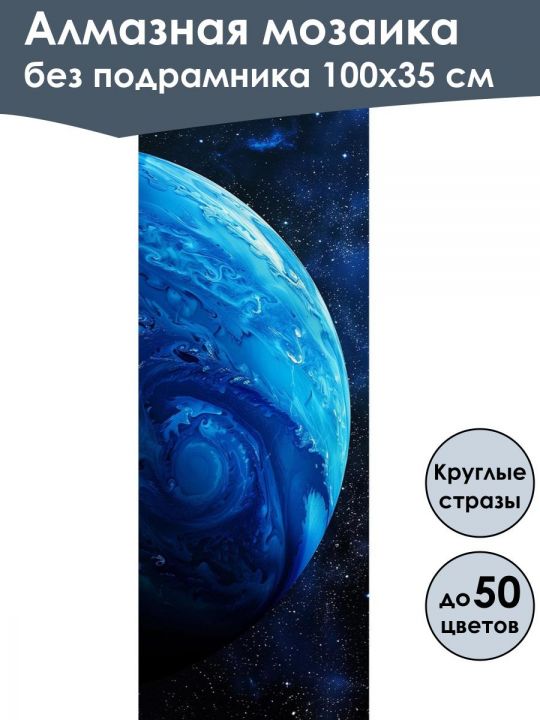 Алмазная мозаика 100×35 см собственного производства без подрамника. В картине используется до 50 оттенков для глубины цвета и плавных переходов. Надёжный клеевой слой не сохнет месяцами, стразы (26 граней) яркие, высокого качества и не отлетают. В наборе присутствуют дополнительно ZIP пакеты, номера и инструменты, для удобства работы со стразами. Картина защищена непрозрачной бумагой. Схема напечатана водными пигментными чернилами (без свинца и запаха) в светлых пастельных тонах для комфортной работы. Плотный полухлопковый холст легко разглаживается и не мнётся. Доставляется в бурой коробке. После сборки мозаика выглядит яркой и эстетичной. Узкие края предназначены для оформления в багет или обычную рамку. На изображении представлена космическая сцена с крупным планом загадочной планеты, окрашенной в насыщенные оттенки синего, с видимыми облачными завихрениями и градациями цвета, на фоне звёздного неба, создающего впечатление глубины и бесконечности космоса.