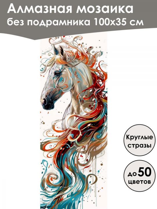 Алмазная мозаика 100×35 см собственного производства без подрамника. В картине используется до 50 оттенков для глубины цвета и плавных переходов. Надёжный клеевой слой не сохнет месяцами, стразы (26 граней) яркие, высокого качества и не отлетают. В наборе присутствуют дополнительно ZIP пакеты, номера и инструменты, для удобства работы со стразами. Картина защищена непрозрачной бумагой. Схема напечатана водными пигментными чернилами (без свинца и запаха) в светлых пастельных тонах для комфортной работы. Плотный полухлопковый холст легко разглаживается и не мнётся. Доставляется в бурой коробке. После сборки мозаика выглядит яркой и эстетичной. Узкие края предназначены для оформления в багет или обычную рамку. Иллюстрация лошади с выразительными крупными глазами выполнена в ярком и динамичном стиле, сочетая элементы абстракции; её грива и тело будто растворяются в мощных струях разноцветных линий — красных, оранжевых, бирюзовых и коричневых; это создаёт ощущение движения и энергии, словно ветер играет с прядями её гривы, белый фон подчеркивает насыщенные цвета, добавляя общей композиции выразительности и эмоционального накала.
