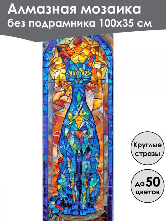 Алмазная мозаика 100×35 см собственного производства без подрамника. В картине используется до 50 оттенков для глубины цвета и плавных переходов. Надёжный клеевой слой не сохнет месяцами, стразы (26 граней) яркие, высокого качества и не отлетают. В наборе присутствуют дополнительно ZIP пакеты, номера и инструменты, для удобства работы со стразами. Картина защищена непрозрачной бумагой. Схема напечатана водными пигментными чернилами (без свинца и запаха) в светлых пастельных тонах для комфортной работы. Плотный полухлопковый холст легко разглаживается и не мнётся. Доставляется в бурой коробке. После сборки мозаика выглядит яркой и эстетичной. Узкие края предназначены для оформления в багет или обычную рамку. Изображение представляет собой красочный витраж с изображением сидящей кошки, выполненной в насыщенных синих, оранжевых и жёлтых тонах, контрастирующих друг с другом, фигура кошки дополнена подробными геометрическими элементами, окружающими её и придающими композиции яркий и динамичный вид, центральное место на изображении занимает кошка с большими выразительными глазами, а задний фон украшен разными оттенками, создающими впечатление сияния и уюта.