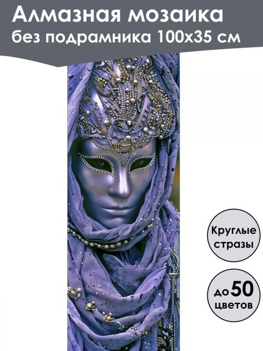 Алмазная мозаика 100×35 см собственного производства без подрамника. В картине используется до 50 оттенков для глубины цвета и плавных переходов. Надёжный клеевой слой не сохнет месяцами, стразы (26 граней) яркие, высокого качества и не отлетают. В наборе присутствуют дополнительно ZIP пакеты, номера и инструменты, для удобства работы со стразами. Картина защищена непрозрачной бумагой. Схема напечатана водными пигментными чернилами (без свинца и запаха) в светлых пастельных тонах для комфортной работы. Плотный полухлопковый холст легко разглаживается и не мнётся. Доставляется в бурой коробке. После сборки мозаика выглядит яркой и эстетичной. Узкие края предназначены для оформления в багет или обычную рамку. Изображение показывает человека в эффектной фиолетовой маске, украшенной бисером и драгоценными камнями, с тщательно драпированным головным убором и накидкой, создающими впечатление загадочности и торжественности.