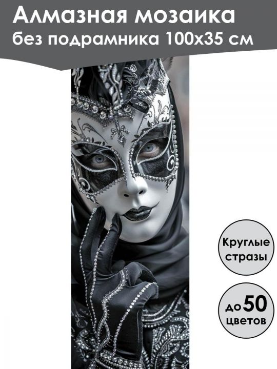 Алмазная мозаика 100×35 см собственного производства без подрамника. В картине используется до 50 оттенков для глубины цвета и плавных переходов. Надёжный клеевой слой не сохнет месяцами, стразы (26 граней) яркие, высокого качества и не отлетают. В наборе присутствуют дополнительно ZIP пакеты, номера и инструменты, для удобства работы со стразами. Картина защищена непрозрачной бумагой. Схема напечатана водными пигментными чернилами (без свинца и запаха) в светлых пастельных тонах для комфортной работы. Плотный полухлопковый холст легко разглаживается и не мнётся. Доставляется в бурой коробке. После сборки мозаика выглядит яркой и эстетичной. Узкие края предназначены для оформления в багет или обычную рамку. На изображении представлена фигура в стиле карнавала с изысканной маской, покрытой сложным узором черно-белых мотивов и блестящими украшениями, с выразительными глазами, акцентированными темным макияжем, и в наряде, декорированном бисером и вышивкой, образ создаёт атмосферу загадочности и элегантности.