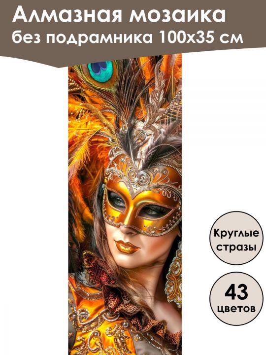 Алмазная мозаика 100×35 см собственного производства без подрамника. В картине используется до 50 оттенков для глубины цвета и плавных переходов. Надёжный клеевой слой не сохнет месяцами, стразы (26 граней) яркие, высокого качества и не отлетают. В наборе присутствуют дополнительно ZIP пакеты, номера и инструменты, для удобства работы со стразами. Картина защищена непрозрачной бумагой. Схема напечатана водными пигментными чернилами (без свинца и запаха) в светлых пастельных тонах для комфортной работы. Плотный полухлопковый холст легко разглаживается и не мнётся. Доставляется в бурой коробке. После сборки мозаика выглядит яркой и эстетичной. Узкие края предназначены для оформления в багет или обычную рамку. На изображении представлен человек в ярком карнавальном костюме с изысканной маской, украшенной перьями и сверкающими элементами в оранжево-золотых тонах; лицо скрыто под маской с черными прорезями для глаз, а в верхней части костюма присутствует большое павлинье перо, создающее атмосферу праздника и мистики.