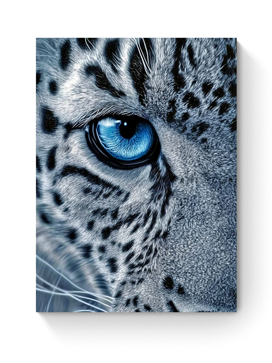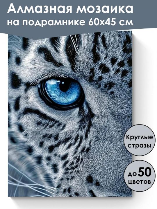 Алмазная мозаика 60×45 см собственного производства на подрамнике. В картине используется до 35 оттенков для глубины цвета и плавных переходов. Надёжный клеевой слой не сохнет месяцами, стразы (26 граней) яркие, высокого качества и не отлетают. В наборе присутствуют дополнительно ZIP пакеты, номера и инструменты, для удобства работы со стразами. Картина защищена прозрачной плёнкой. Схема напечатана водными пигментными чернилами (без свинца и запаха) в светлых пастельных тонах для комфортной работы. Плотный полухлопковый холст легко разглаживается и не мнётся. Доставляется в бурой коробке. После сборки мозаика выглядит яркой и эстетичной. Картину можно повесить на стену используя крепление которое идёт в комплекте. Изображение крупным планом демонстрирует часть морды леопарда или гепарда с выразительным голубым глазом, окружённым пятнистым серым мехом, создающим эффектный контраст между цветом глаза и текстурой шерсти.